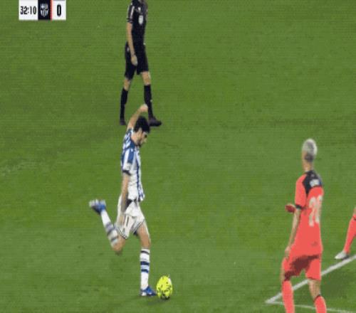 第7分钟,巴萨加强前场逼抢,奥尔莫没有踢到皮球,倒是踢倒了久保建英,费尔明的射门直奔死角。