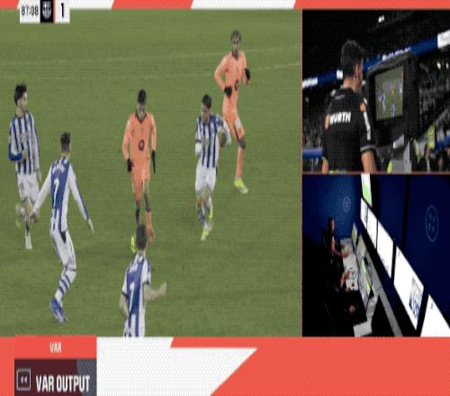 久保建英和奥亚萨瓦尔都向裁判投诉,VAR介入,认定奥尔莫犯规在先,进球无效。